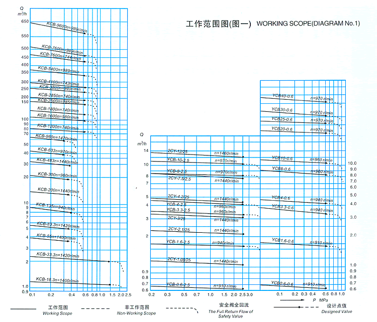 各型齒輪泵性能參數(shù)中給出的排出壓力是給出的較大的工作壓力值,在此范圍內(nèi)泵均能正常工作,其工作范圍見(jiàn)圖一。